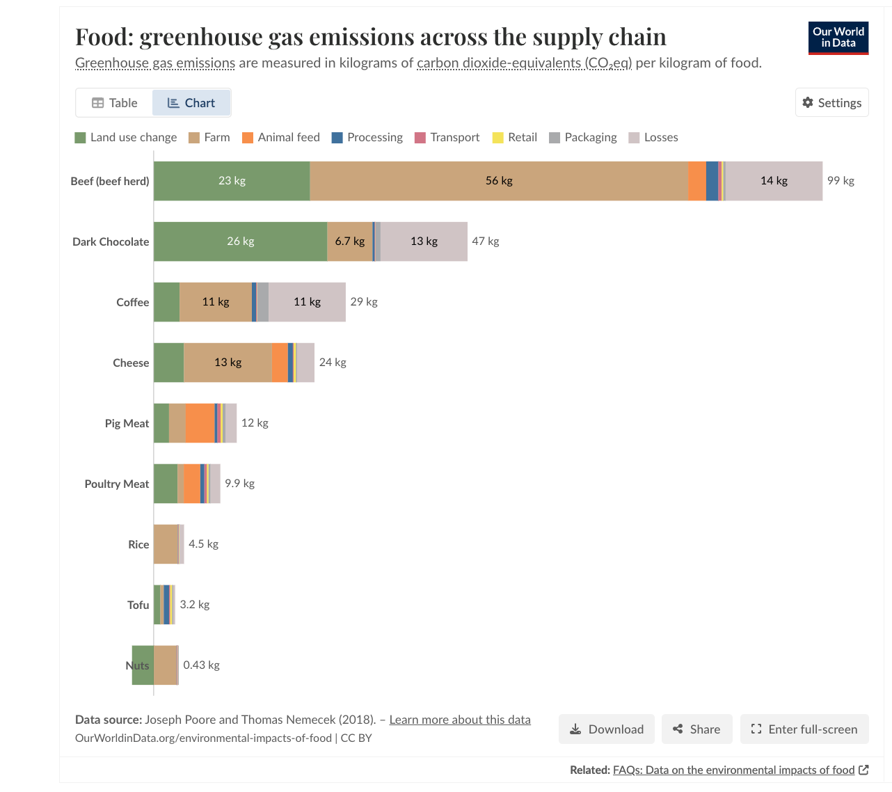Note that the emissions in green are due to land use change, which is mostly deforestation. 55% of chocolate’s emissions come from carbon emitted when the forest is cut. Interestingly, because nut trees absorb more carbon than they emit, the green bar under nuts is to the left of zero.