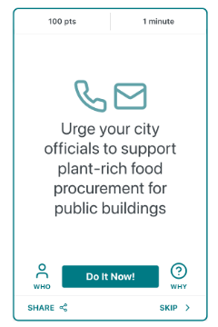 Advocate for plant-based diets in your school, work place, and with public officials. The nonprofit Friends of the Earth provides resources to help school districts adopt climate-friendly school meals. You can share these materials with your local school district. You can talk to your workplace or university dining about adopting the Cool Food Pledge to institute more plant-rich meals. Or use the Climate Action Now* platform to send an email advocating for climate friendly procurement to your mayor and city council.