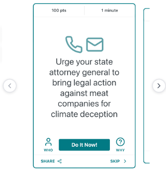 Urge your state attorney general* to bring legal action against the big meat companies for deceptive advertising. New York State Attorney General Tish James successfully sued JBS, the world’s largest meat producer, for falsely advertising its intent to lower its climate emissions. Other attorney generals might be interested in similar cases from the consumer protection and/or climate angle.